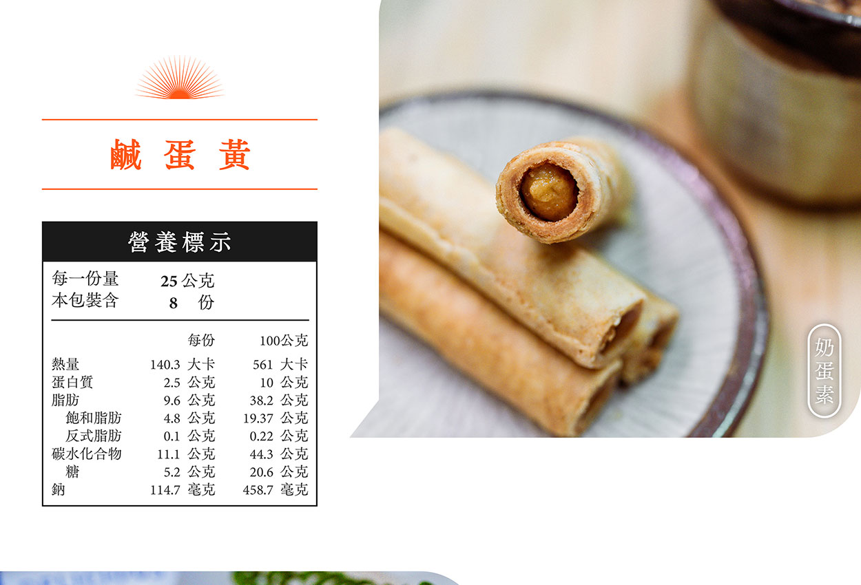 鹹蛋黃【奶蛋素】:鹹蛋黃醬(麵粉、芥花油、糖、棕櫚油、蛋黃粉、鹹蛋黃、鹽、水解卵磷脂)、雞蛋、麵粉、糖粉、植物油(棕櫚油、硬脂棕油)、奶油 *本產品含有麩質的穀類、雞蛋、奶類、大豆其製品之過敏原,不適合其過敏體質者食用