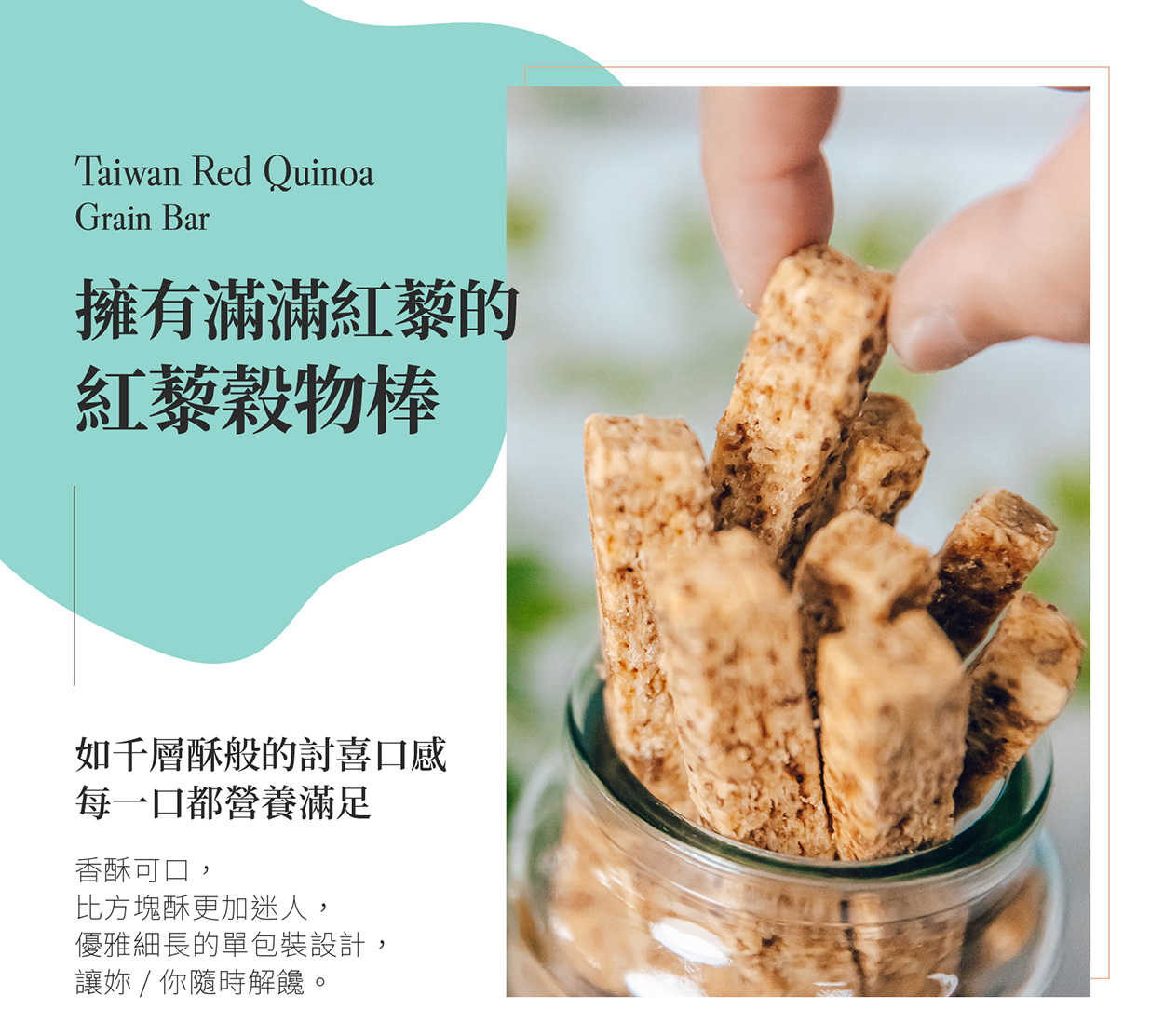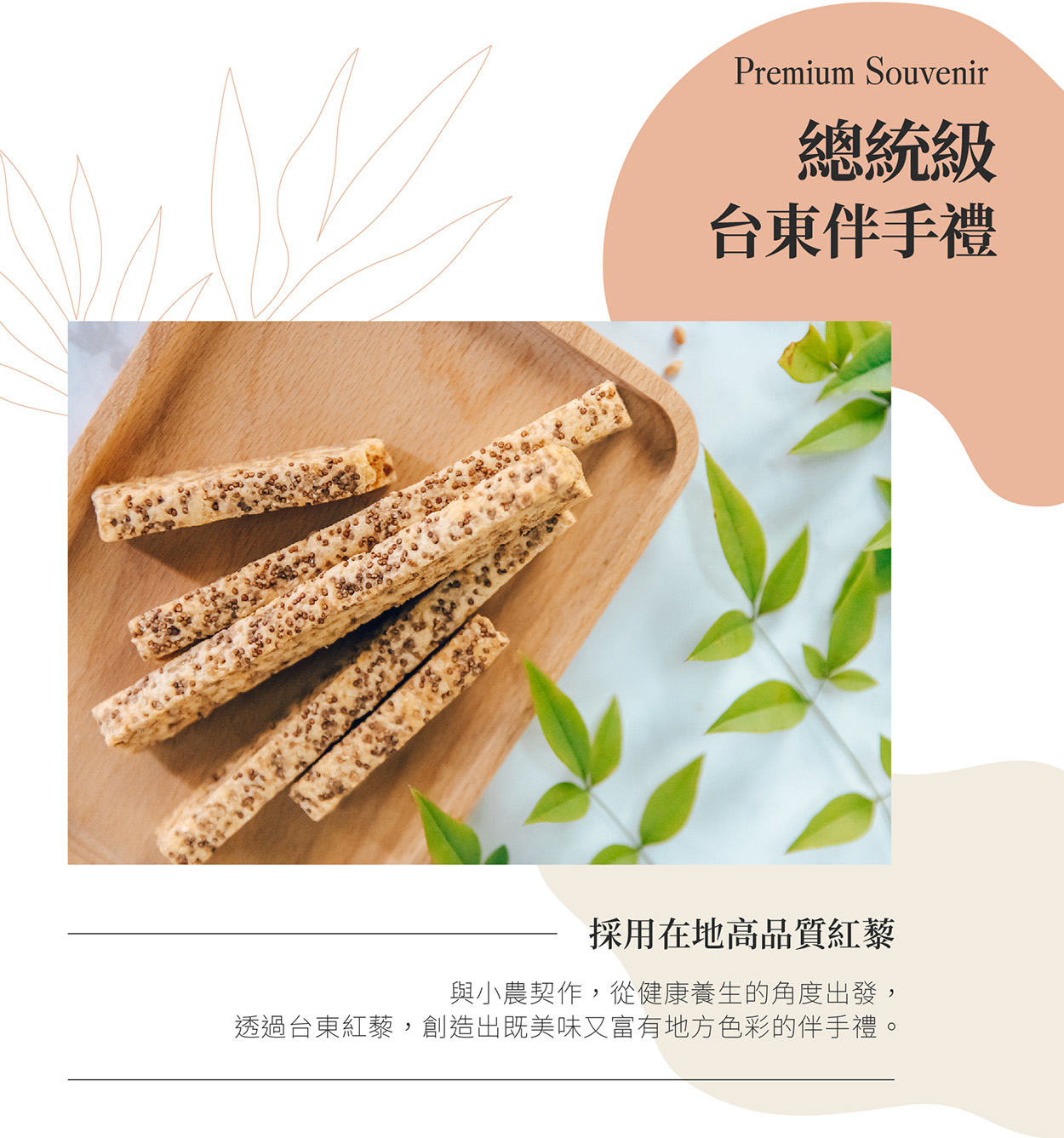 選用「台東紅藜」為主要食材, 紅藜食材加上穀物棒的香脆,大人小孩都愛吃,愈吃愈涮嘴,方便攜帶小包裝,營養美味的超人氣總統級伴手禮。