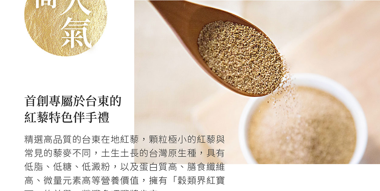 台東擁有最純淨的環境,孕育出聞名全台的農產品。「台東紅藜」是台灣的超級食物,近幾年來深受許多消費者喜愛,台灣原生種紅藜與其他常見的藜麥不同,顆粒極小、且外殼顏色濃烈,營養價值極高!豐富的優質蛋白質、多種胺基酸、礦物質及膳食纖維,有著「穀物界紅寶石」的美名。