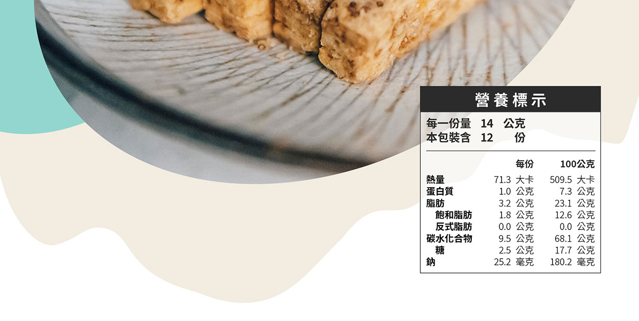 - 成 分:麵粉、植物酥油〔植物油(棕櫚油、大豆油)、大豆卵磷脂、抗氧化劑-維生素E(混合濃縮生育醇、芥花油)、著色劑-β胡蘿蔔素(玉米油、β胡蘿蔔素)〕、砂糖、水、台東紅藜(去殼)、乾酪粉(牛奶、鹽、培養菌種、酵素微結晶狀α-纖維素)、岩鹽