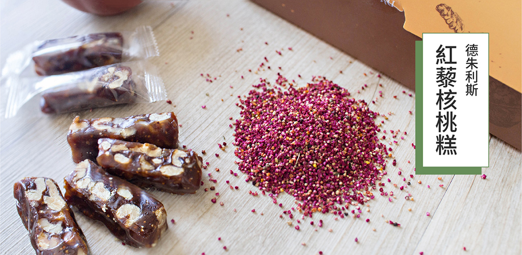德朱利斯「紅藜核桃糕」經過熬煮後,形體凝聚有咬勁,甜度適中,每一口都能感受到核桃香氣與紅藜顆粒,軟Q香醇,絕倫的口感滋味深受喜愛。