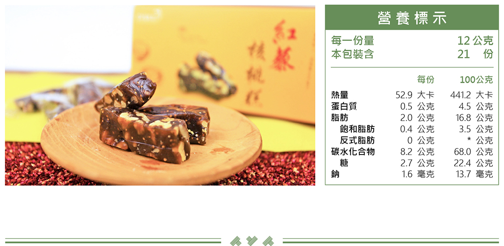 - 成 分:核桃、麥芽、海藻糖、棗泥、烏豆沙、樹薯澱粉、棕櫚油、台東紅藜(去殼)、碘鹽