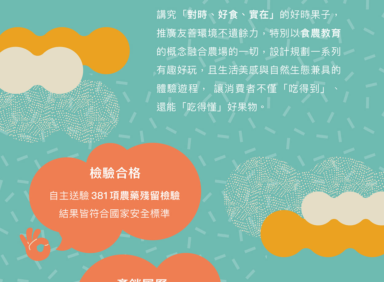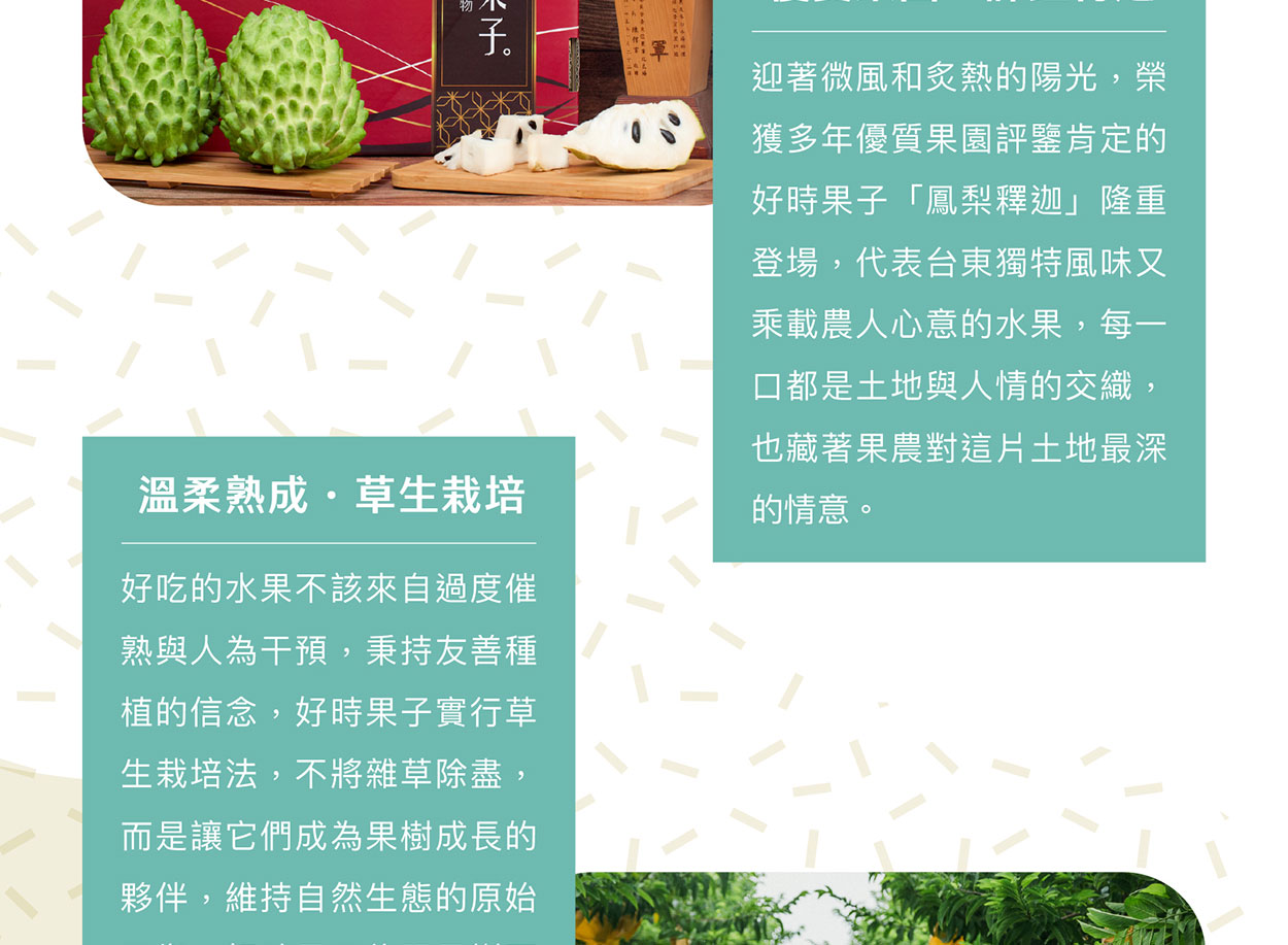 好吃的水果不該來自過度催熟與人為干預,秉持友善種植的信念,好時果子實行草生栽培法,不將雜草除盡,而是讓它們成為果樹成長的夥伴,維持自然生態的原始平衡。好時果子依照果樹不同階段給予適當的養分,肥料的合理使用搭配大自然豐富變化,經四季遞嬗,栽種出充滿生命力和獨特風味的鳳梨釋迦。