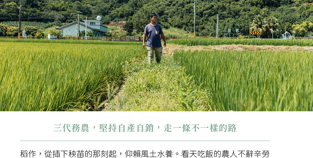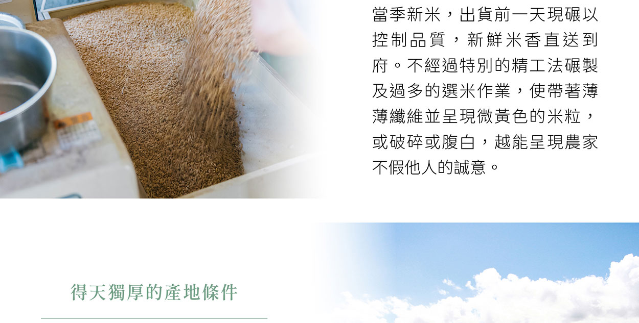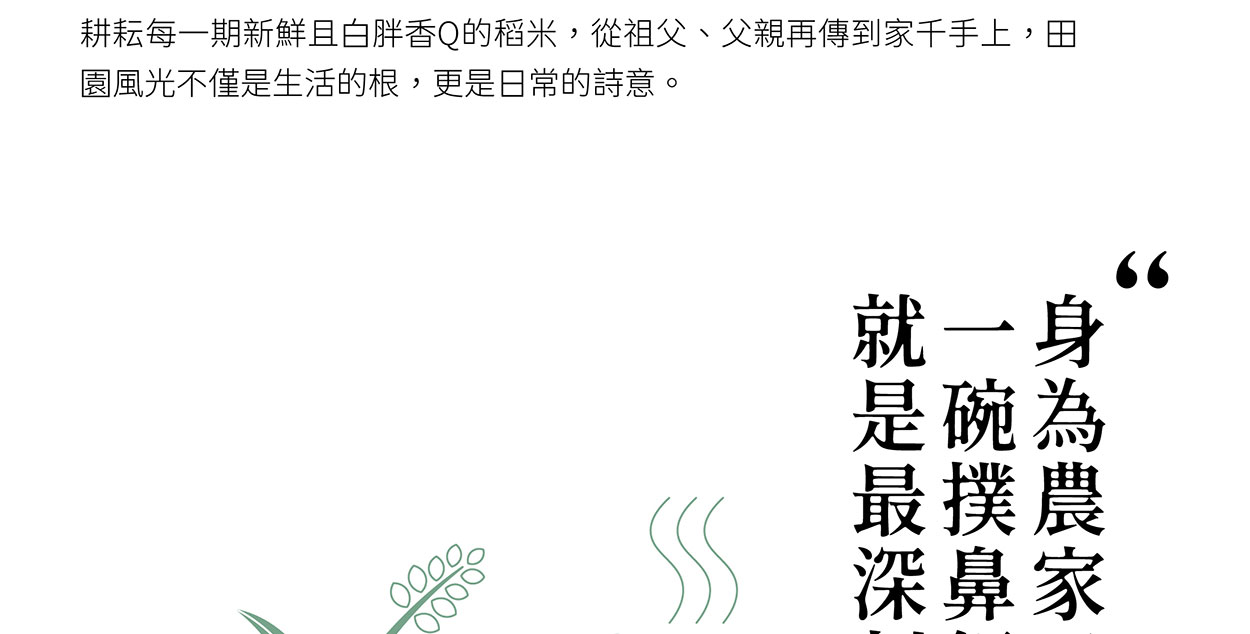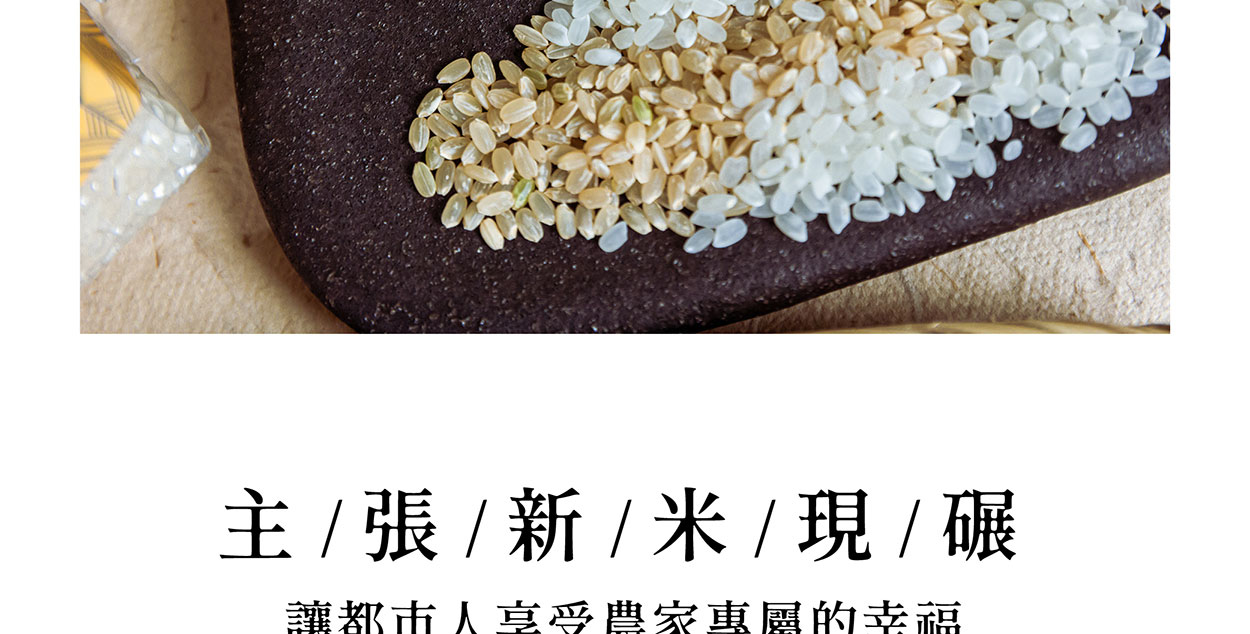主張新米現碾,讓都市人享受農家專屬的幸福。當季新米,出貨前一天現碾以控制品質,新鮮米香直送到府。不經過特別的精工法碾製及過多的選米作業,使帶著薄薄纖維並呈現微黃色的米粒,或破碎或腹白,越能呈現農家不假他人的誠意。三代務農,堅持自產自銷走一條不一樣的路。看天吃飯的農人不辭辛勞耕耘每一期新鮮且白胖香Q的稻米,從祖父、父親再傳到家千手上,田園風光不僅是生活的根,更是日常的詩意。