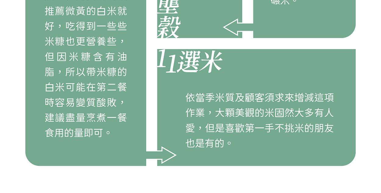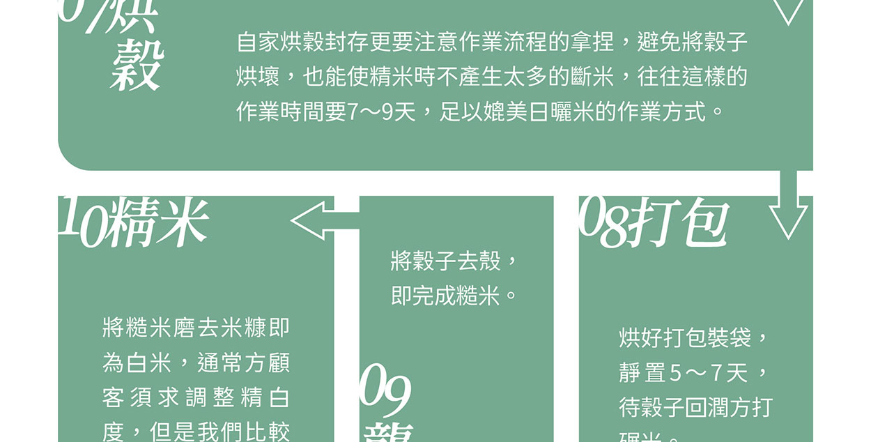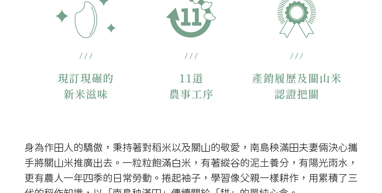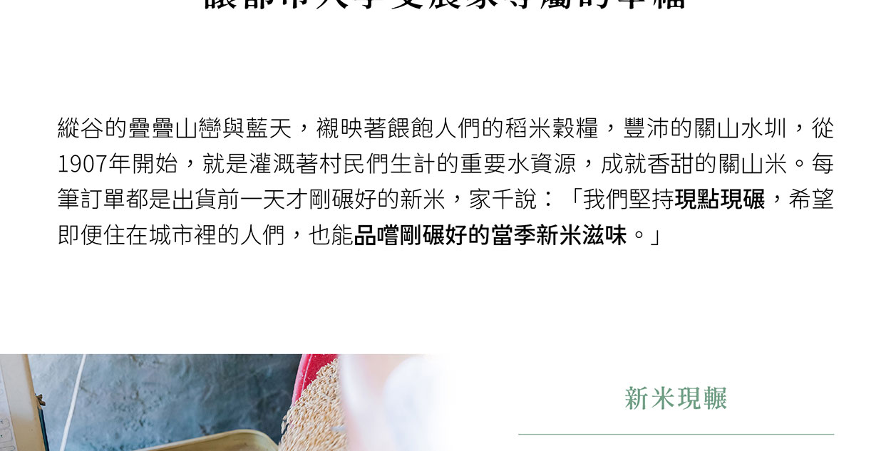 主張新米現碾,讓都市人享受農家專屬的幸福。當季新米,出貨前一天現碾以控制品質,新鮮米香直送到府。不經過特別的精工法碾製及過多的選米作業,使帶著薄薄纖維並呈現微黃色的米粒,或破碎或腹白,越能呈現農家不假他人的誠意。三代務農,堅持自產自銷走一條不一樣的路。看天吃飯的農人不辭辛勞耕耘每一期新鮮且白胖香Q的稻米,從祖父、父親再傳到家千手上,田園風光不僅是生活的根,更是日常的詩意。