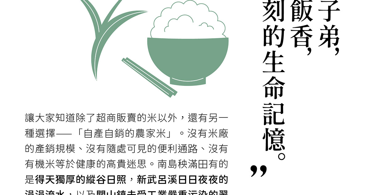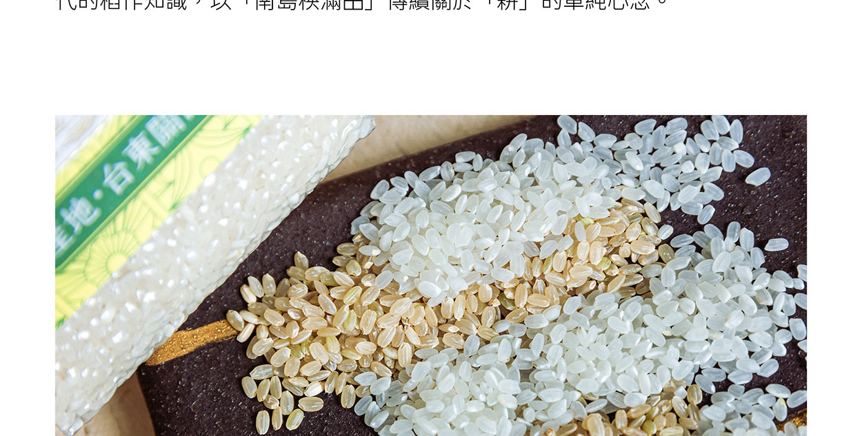 【南島秧滿田】身為作田人的驕傲,秉持著對稻米以及關山的敬愛,南島秧滿田夫妻倆決心攜手將關山米推廣出去。一粒粒飽滿白米,有著縱谷的泥土養分,有陽光雨水,更有農人一年四季的日常勞動。捲起袖子,學習像父親一樣耕作,用累積了三代的稻作知識,以「南島秧滿田」傳續關於「耕」的單純心念。