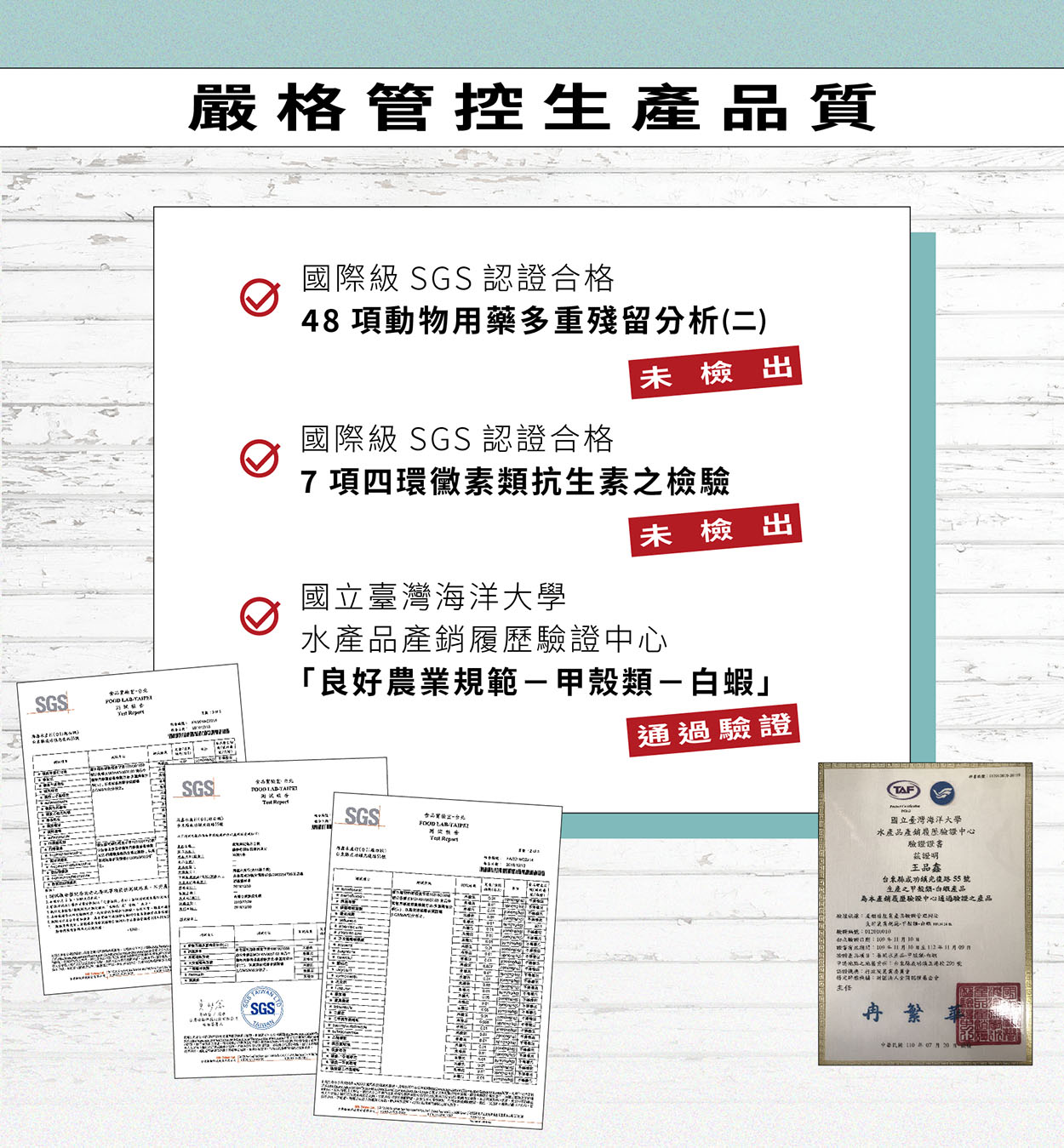 來自東海岸太平洋的海味白蝦,扎實Q彈又鮮甜有味;嚴格控管生產品質,送驗國際級SGS認證合格。