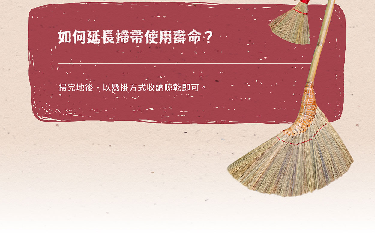 雖然身處每家一台吸塵器的時代,掃把仍在家中留有一席之地,像是大型物件掃除、玻璃破碎清除或是牆角的隙縫清潔,大支手綁掃把清塵效果絕佳!