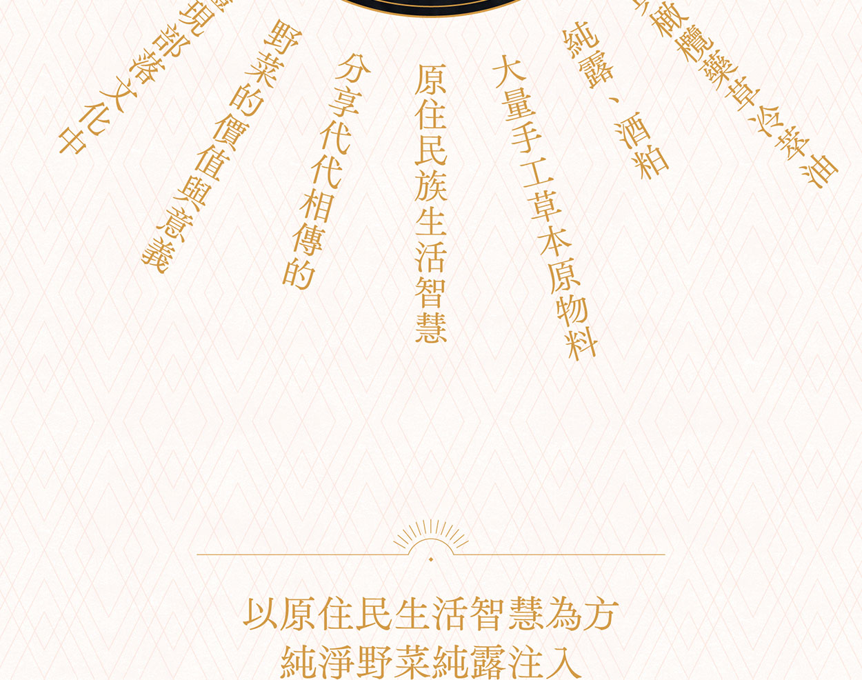 踏入山林、吹著海風,原住民從大自然冰箱裡,順著四季,感謝、拿取、珍惜。太陽曬熟、月亮養成、讓雨水甘泉天然養成的野菜、野果、野花們,有著部落老人家長久而珍貴的生活智慧,述說、傳承、轉化、重製,文化又再一次活出了時代,一塊塊樸實而豐華的手工皂,注入滿滿野菜純露的生命力,滋養洗滌你我的每一日。
